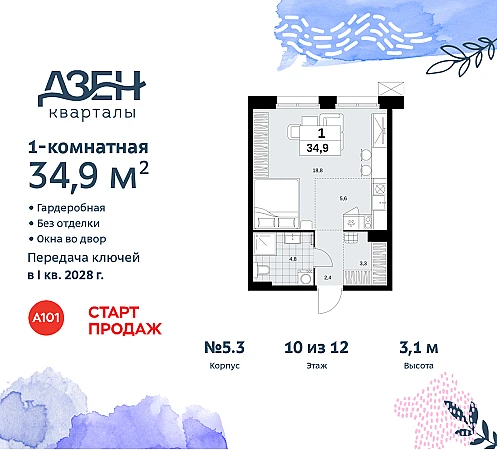 Просторная 1-комн. квартира бизнес-класса-студия в ЖК "Дзен-кварталы" на 10 этаже. Квартира без отделки, после получения ключей можно делать ремонт. Общая площадь: 34.9 кв.м., площадь гостиной 24.4 кв.м., из которых 5.6 кв.м. выделено под кухонную зону. Все окна выходят на одну сторону. В квартире один совмещенный санузел. Высота потолков 3.1 м.
