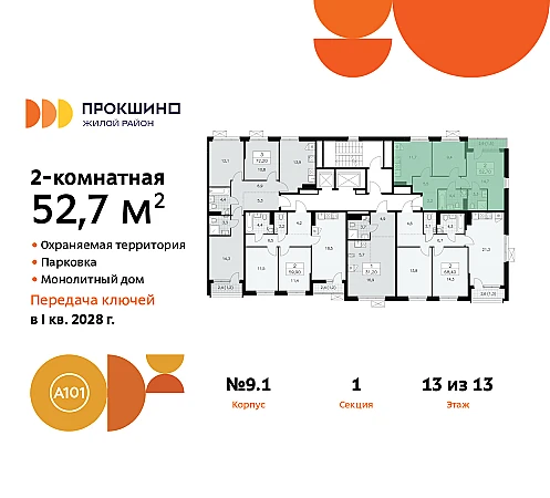 Дом монолитный, двухподъездный, высотой 13 этажей. Квартира находится в 1-й секции в корпусе 9.1. На этаже 5 квартир. В подъезде 1 пассажирский и 1 грузовой лифт. Начало строительства - 3 квартал 2025 года. Окончание строительства - 4 квартал 2027 года. Оформление сделки по договору долевого участия.
