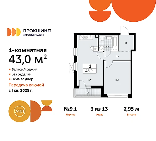 1-комн. квартира от застройщика в ЖК "Прокшино" на 3 этаже. Квартира без отделки, полностью готова к ремонту. Общая площадь: 43 кв.м., жилая: 12.6 кв.м., площадь просторной кухни-столовой: 17.7 кв.м. Угловая квартира, идеально подойдет любителям тишины и панорамных видов. В квартире одна лоджия, один совмещенный санузел. Высота потолков 2.95 м.