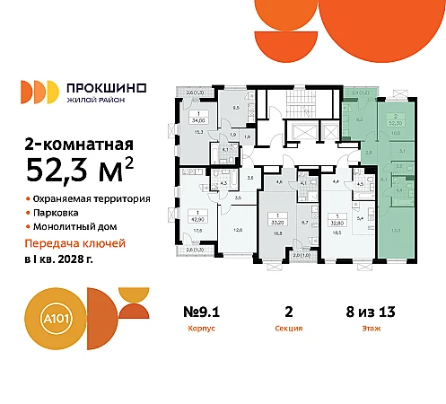 Дом монолитный, двухподъездный, высотой 13 этажей. Квартира находится во 2-й секции в корпусе 9.1. На этаже 5 квартир. В подъезде 1 пассажирский и 1 грузовой лифт. Начало строительства - 3 квартал 2025 года. Окончание строительства - 4 квартал 2027 года. Оформление сделки по договору долевого участия.