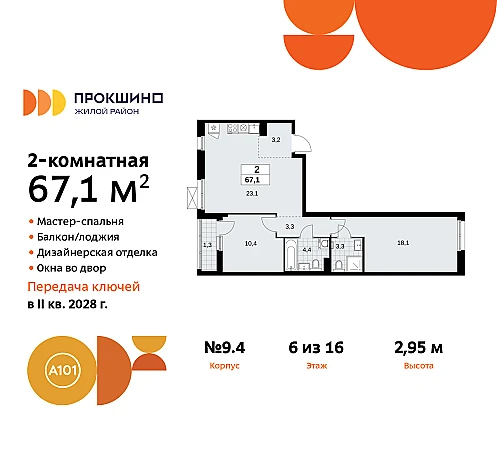 2-комн. квартира с отделкой в ЖК "Прокшино" на 6 этаже. Общая площадь: 67.1 кв.м., жилая: 28.5 кв.м., площадь просторной кухни-столовой: 23.1 кв.м. Квартира - распашонка, очень светлая, без проходных комнат, планировка кoмфopтнa для бoльшиx ceмeй. В квартире одна лоджия, два совмещенных санузла. Высота потолков 2.95 м.