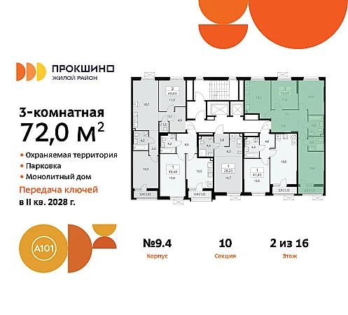 Дом монолитный, черырехподъездный, переменной этажности, от 10 до 16 этажей. Квартира находится в 3-й секции высотой 13 этажей в корпусе 9.4. На этаже 5 квартир. В подъезде 1 пассажирский и 1 грузовой лифт. Начало строительства - 3 квартал 2025 года. Окончание строительства - 4 квартал 2027 года. Оформление сделки по договору долевого участия.