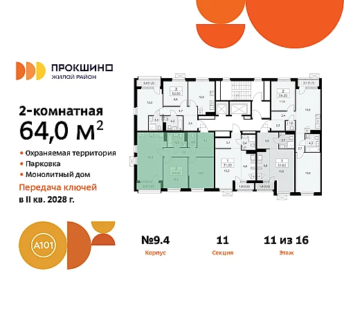 Дом монолитный, черырехподъездный, переменной этажности, от 10 до 16 этажей. Квартира находится в 4-й секции высотой 15 этажей в корпусе 9.4. На этаже 5 квартир. В подъезде 1 пассажирский и 1 грузовой лифт. Начало строительства - 3 квартал 2025 года. Окончание строительства - 4 квартал 2027 года. Оформление сделки по договору долевого участия.