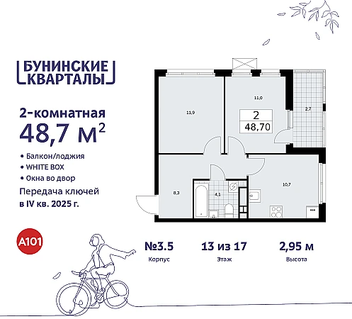 Продается 2-комн. квартира с предчистовой отделкой в ЖК "Бунинские кварталы" на 13 этаже. Общая площадь: 48.6 кв.м., жилая: 22.9 кв.м., площадь просторной кухни-столовой: 10.7 кв.м. Квартира угловая, очень светлая, естественная вентиляция при открытии окон. В квартире одна лоджия, один совмещенный санузел. Высота потолков 2.95 м.