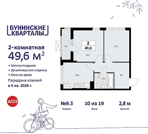Двухкомнатная квартира от застройщика с отделкой в ЖК "Бунинские кварталы" на 10 этаже. Общая площадь: 49.6 кв.м., жилая: 24.3 кв.м., площадь просторной кухни-столовой: 10.8 кв.м. Квартира угловая, идеально подойдет любителям тишины и панорамных видов. В квартире одна лоджия, один совмещенный санузел. Высота потолков 2.8 м.