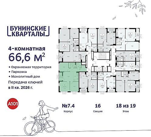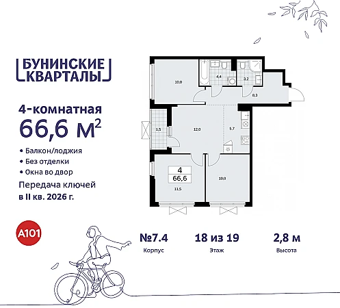 4-комн. квартира в ЖК "Бунинские кварталы" на 18 этаже. Квартира без отделки, после получения ключей можно делать ремонт. Общая площадь: 66.5 кв.м. Высота потолков 2.8 м.