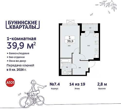 Однокомнатная квартира в ЖК "Бунинские кварталы" на 14 этаже. Квартира без отделки, полностью готова к ремонту. Общая площадь: 39.7 кв.м. Высота потолков 2.8 м.