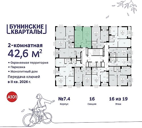 2-комн. квартира в ЖК "Бунинские кварталы" на 16 этаже. Квартира без отделки, новый собственник может сделать ремонт по своему дизайн-проекту. Общая площадь: 42.4 кв.м. Высота потолков 2.8 м.