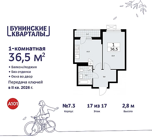 Купить 1к квартиру 36 м² в ЖК "Бунинские кварталы"