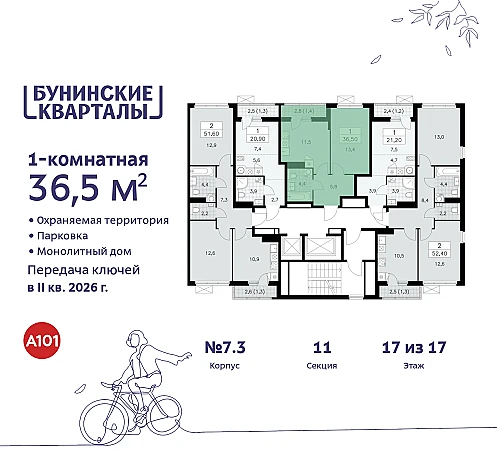 Дом монолитный, многоподъездный, переменной этажности, от 9 до 17 этажей. Квартира находится в 3-й секции высотой 17 этажей в корпусе 7.3. На этаже 5 квартир. В подъезде 1 пассажирский и 1 грузовой лифт. Начало строительства - 4 квартал 2023 года. Окончание строительства - 2 квартал 2026 года. Оформление сделки по договору долевого участия.