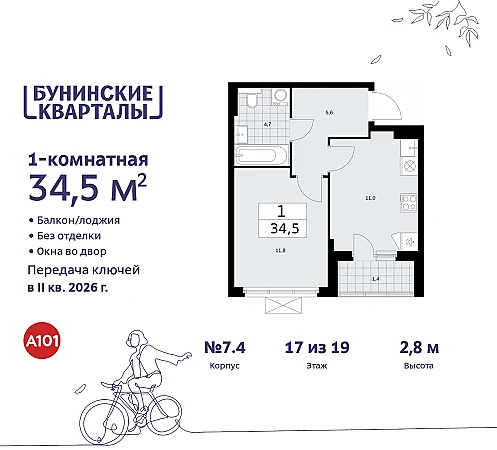 Продается 1-комн. квартира в ЖК "Бунинские кварталы" на 17 этаже. Квартира без отделки, новый собственник может сделать ремонт по своему проекту. Общая площадь: 34.6 кв.м. Высота потолков 2.8 м.