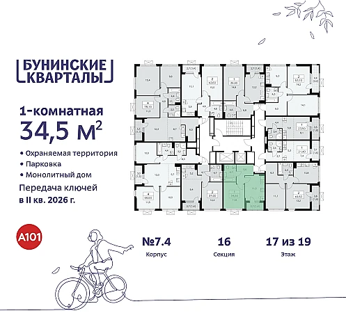 Купить 1к квартиру 34 м² в ЖК "Бунинские кварталы"