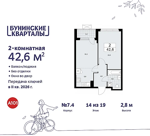 2-комн. квартира в ЖК "Бунинские кварталы" на 14 этаже. Квартира без отделки, полностью готова к чистовой отделке и дальнейшему ремонту. Общая площадь: 42.5 кв.м. Высота потолков 2.8 м.