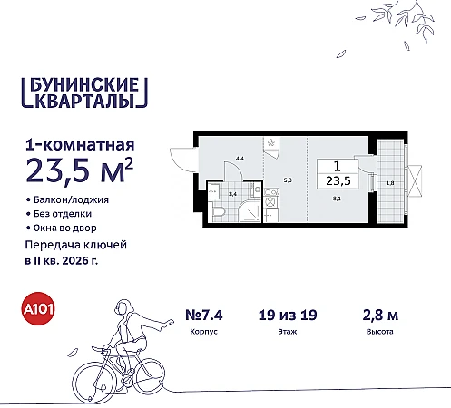 Купить 1к квартиру 23 м² в ЖК "Бунинские кварталы"