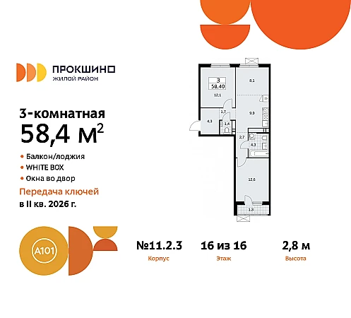 Продается 3-комн. квартира от застройщика с отделкой в ЖК "Прокшино" на 16 этаже. Общая площадь: 58.5 кв.м. Высота потолков 2.8 м.