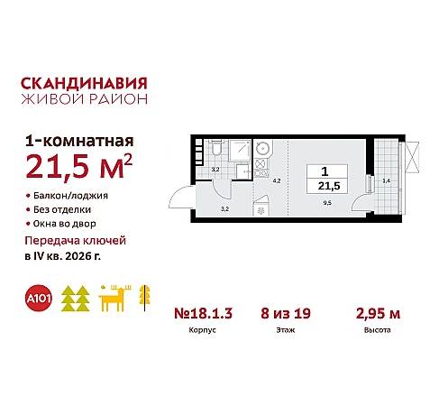 1-комн. квартира-студия в ЖК "Скандинавия" на 8 этаже. Квартира без отделки, после оформления собственности можно делать ремонт. Общая площадь: 21.5 кв.м., площадь гостиной 13.7 кв.м., из которых 4.2 кв.м. выделено под кухонную зону. Все окна выходят на одну сторону. В квартире один балкон, один совмещенный санузел. Высота потолков 2.95 м.