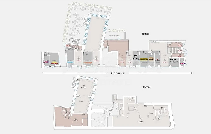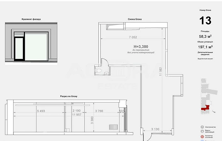 Площадь 58,3 кв.м (на плане - Блок 13), 1 этаж, отдельный вход с улицы. Планировка открытая, высокие потолки, состояние - за выездом арендатора.