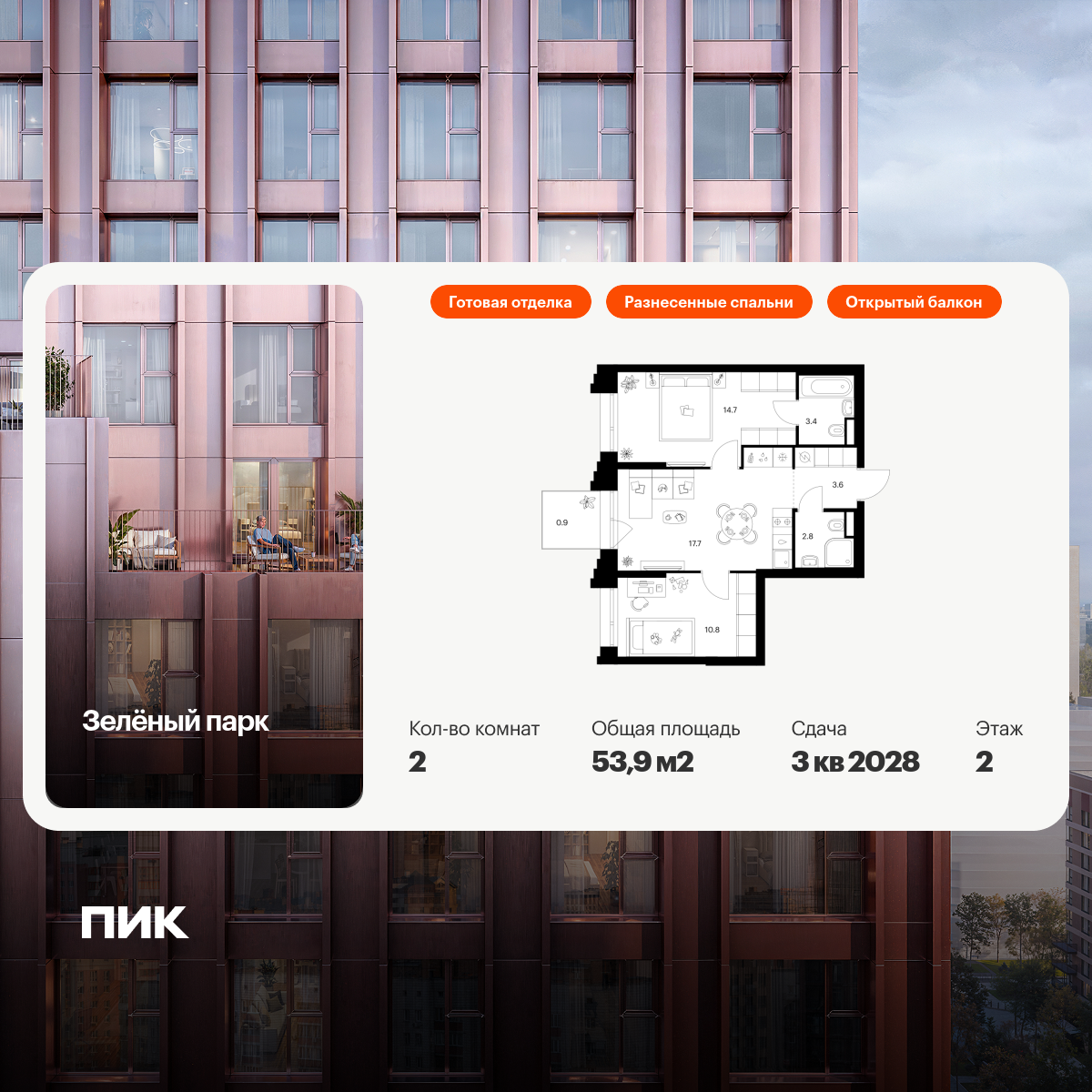 Продаётся 2-комн.квартира площадью 53.90 кв.м на 2 этаже 28 этажного дома (Корпус 5.4, секция 5) проекта ПИК Зелёный парк. Светлый просторный подъезд на уровне земли, функциональная планировка, большие окна, с отделкой.