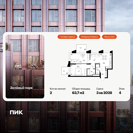 Продаётся 2-комн.квартира площадью 63.70 кв.м на 4 этаже 28 этажного дома (Корпус 5.4, секция 5) проекта ПИК Зелёный парк. Светлый просторный подъезд на уровне земли, функциональная планировка, большие окна, с отделкой.