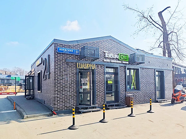 Отделка фасадов выполнена панелями с имитацией клинкерного кирпича. Дополнительно на территории организованы зоны отдыха на свежем воздухе, также дополнительно имеется возможность для организации летних веранд и кафе.