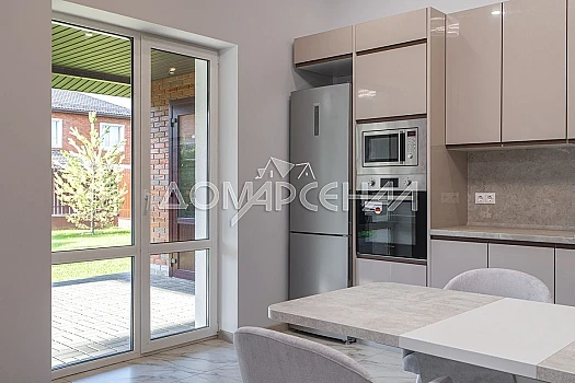 Благоустройство: на участке уложен рулонный газон, вокруг дома выполнена отмостка из брусчатки. Есть площадка для парковки автомобилей и дорожки, также уложенные брусчаткой.Высажены деревья и декоративные насаждения.
