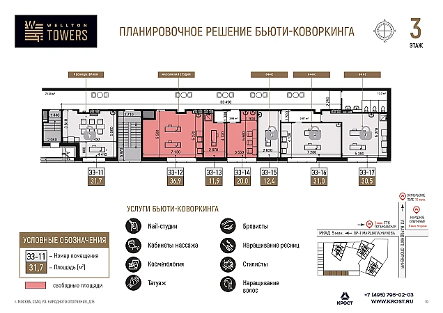 Помещение 31,9 кв.м. в аренду на 3 этаже ЖК Wellton Towers, расположенного по адресу: Москва, СЗАО, р-н Хорошево-Мневники, ул. Народное Ополчение д.15 стр.5, в квартале Wellton Park. Плотный жилой массив района Хорошево-Мневники. 8 мин до станции метро "Народное ополчение". Высокий пешеходный трафик.