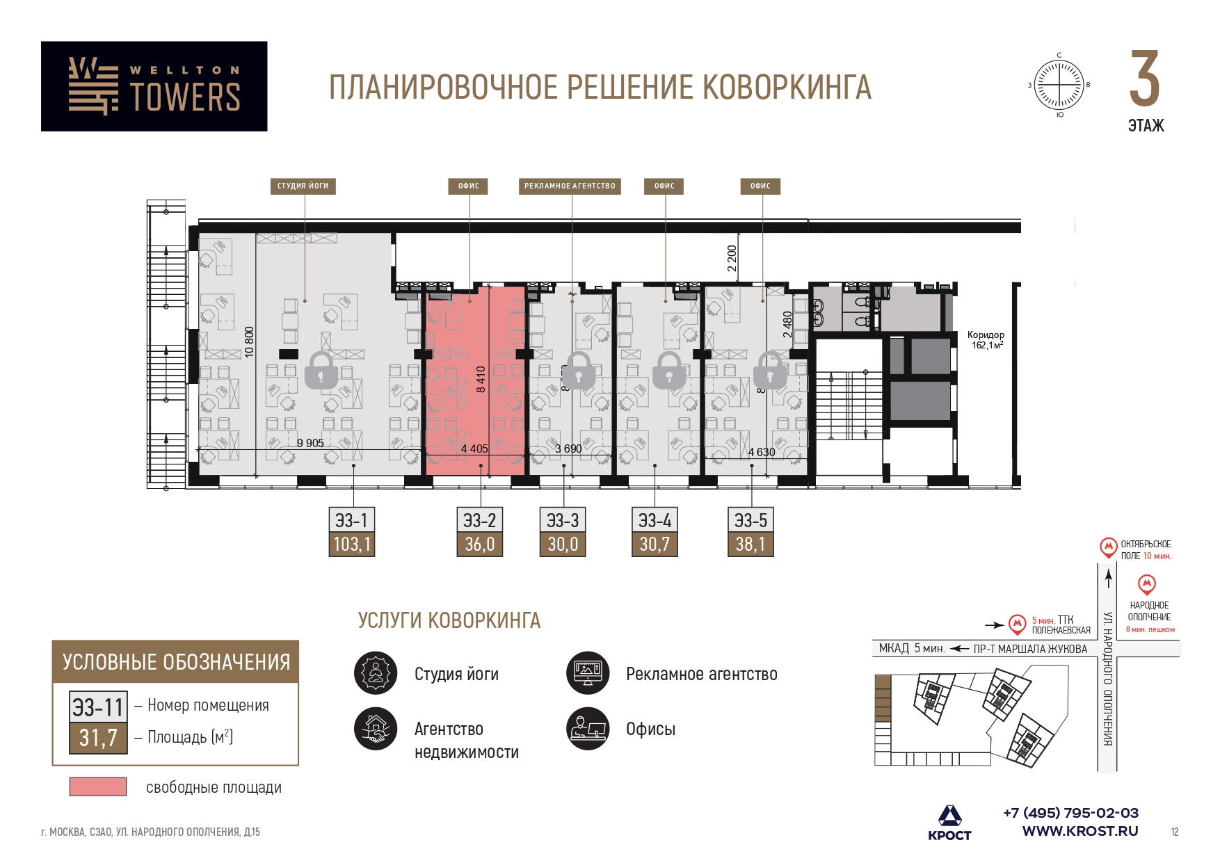 Помещение 36 кв.м. в аренду на 3 этаже ЖК Wellton Towers, расположенного по адресу: Москва, СЗАО, р-н Хорошево-Мневники, ул. Народное Ополчение д.15 стр.5, в квартале Wellton Park. Плотный жилой массив района Хорошево-Мневники. 8 мин до станции метро "Народное ополчение". Высокий пешеходный трафик.