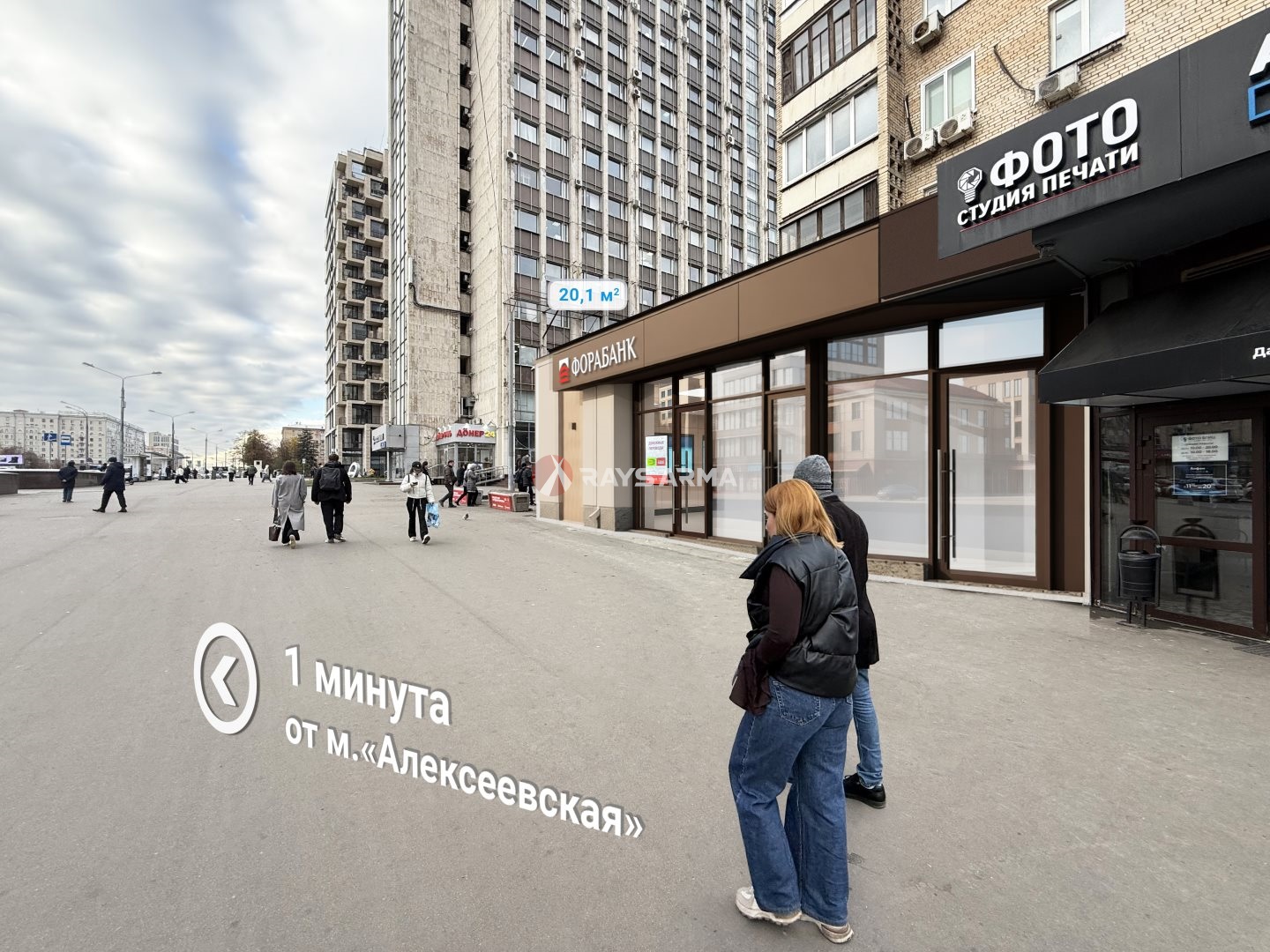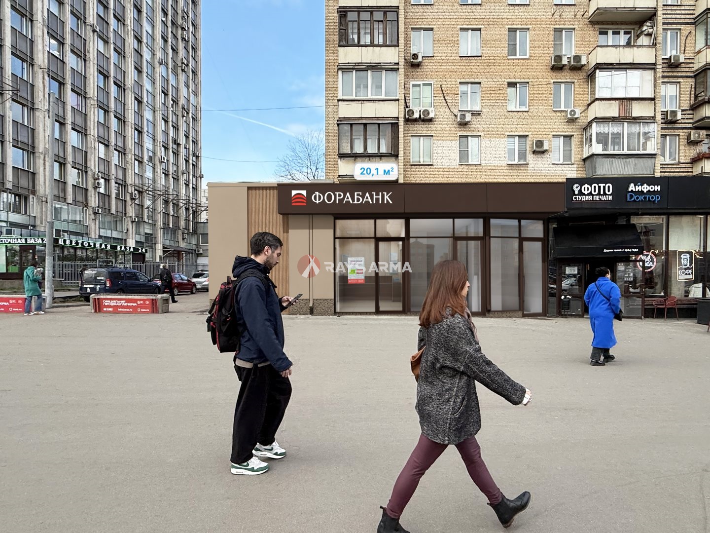 Сверхинтенсивный пешеходный и автомобильный трафик вдоль помещения.