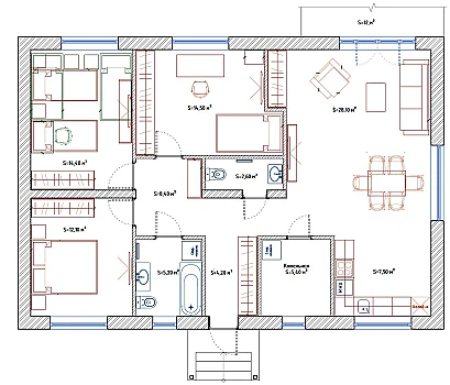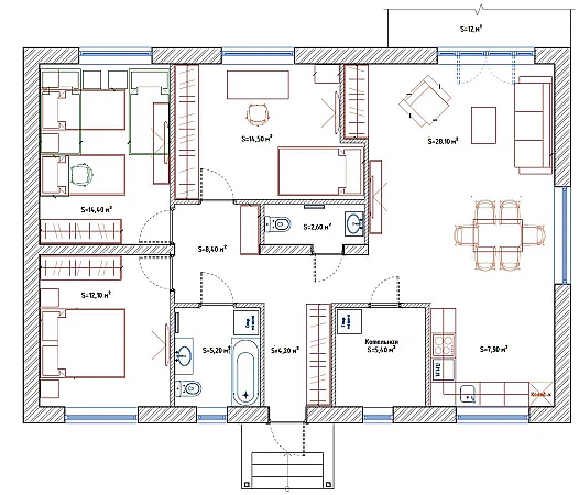 3 изолированные комнаты 12,1/14,4/14,5 кв.м, ванная комната, гостевой с/у, бойлерная, прихожая.