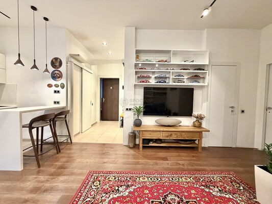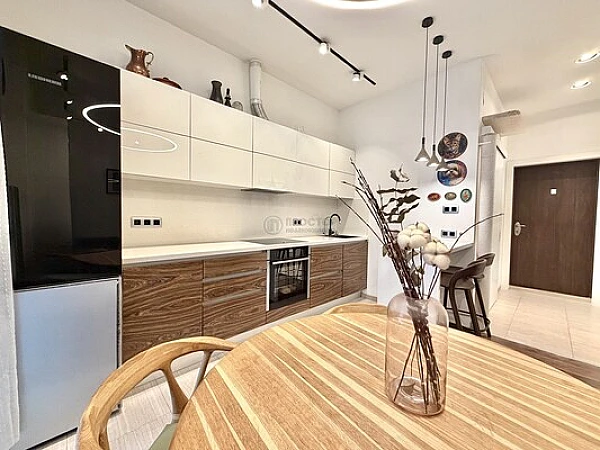 Квартира имеет функциональную планировку: 2 изолированные спальни, кухня-гостиная, гардеробная, постирочная и санузел. Межквартирные перегородки выполнены из кирпича, что обеспечивает высокую шумоизолицию. В квартира выполнена дизайнерская чистовая отделка, вся мебель и встроенная техника остаются для новых владельцев.