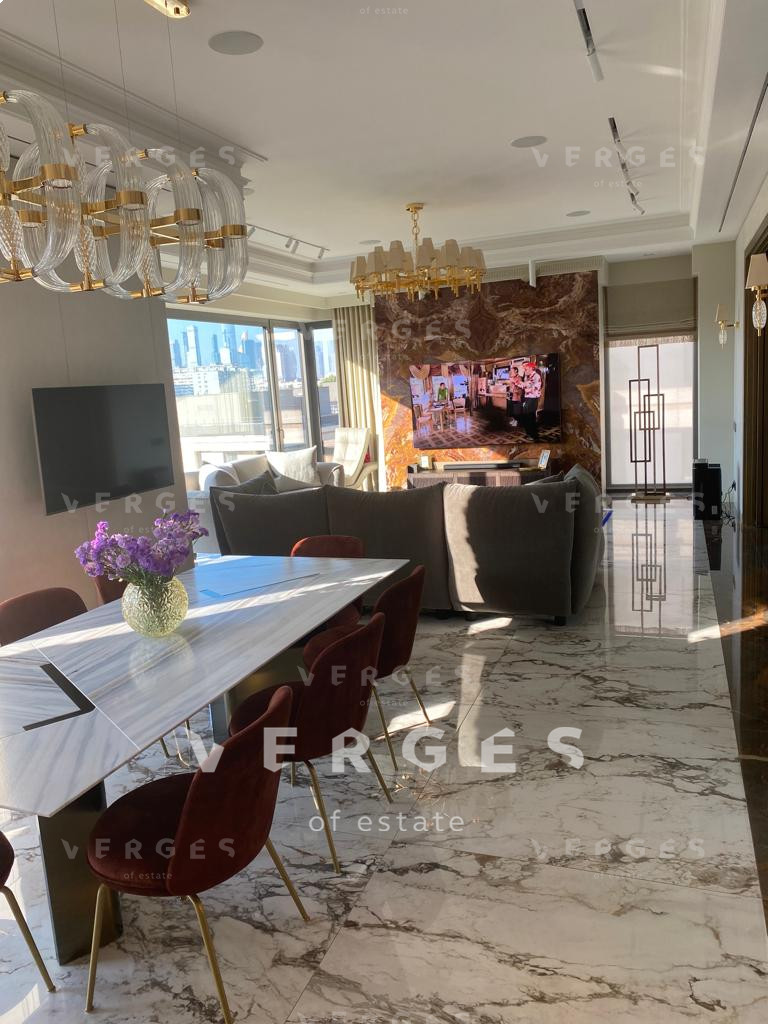 Уникальное предложение! Продажа квартиры 362 кв.м. с авторским дизайнерским ремонтом, в отделке использовались только качественные и натуральные материалы. Планировка: 4 спальни, кухня-гостиная, спорт зал, кабинет, 4 санузла, 4 лоджии, гардеробные. Максимальная приватность и камерность, единственная четрырехсторонняя квартира на этаже, виды из окон на благоустроенную территорию, в сторону пруда, сити и поклонную гору. Высокие потолки 3,5 метра. В квартире очень тихо, благодаря качественным стеклопакетам Rayners (Бельгия) и расположению корпуса. Приятная входная группа и бесшумный лифт Tyssen Crupp (Австрия). Централизованная проточно-вытяжная вентиляция и кондиционирование. Дом соответствует классу элитного жилья и идеально подойдет для семьи с детьми, на территории есть детские площадки и самая лучшая школа в районе Снегири , прямой выход с территории к Мосфильмовскому пруду.