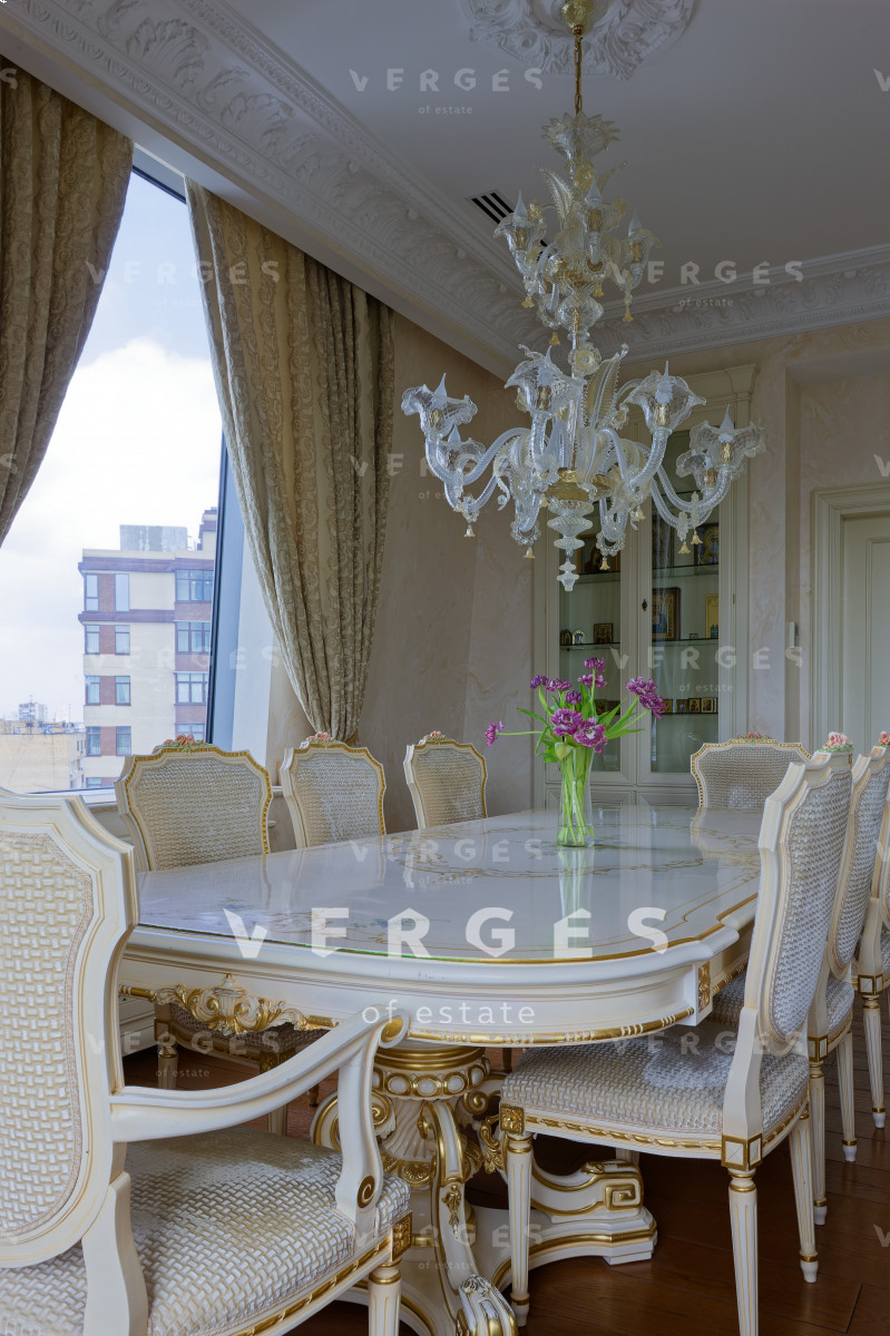 ЖК Дом на Мосфильмовской Расположение на 11 этаже 33 этажного корпуса. Площадь после обмеров 167 кв.м., согласно выписке ЕГРН площадь составляет 152.4 кв.м. Светлая квартира, классический стиль, в отделке использовались только качественные, натуральные и дорогие материалы: венецианская штукатурка, лепнина, мрамор, вся мебель из Италии. Бытовая техника Kuppersbusch, встроенная в кухонный гарнитур. Фактически 2 спальни, но возможно сделать третью спальню вместо гардеробной. Планировка: кухня 15 кв.м. , гостиная 48 кв.м., мастер спальня 24 кв.м. с санузлом (душ и ванна) 11 кв.м. и гардеробной комнатой (с окном) 17 кв.м., детская спальня 20 кв.м., санузел (душ) 8 кв.м. постирочная, прихожая 16 кв.м. Из панорамных окон виды в сторону Парка Победы.