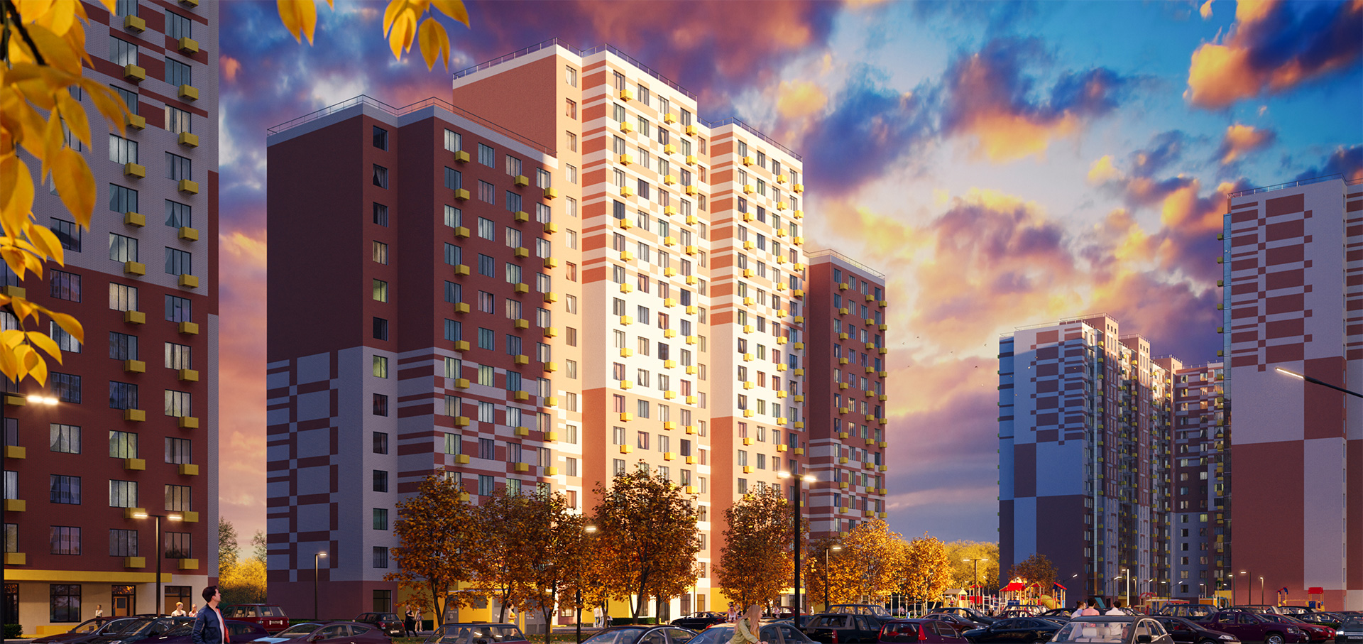 Во дворах — зелёные парки с местами отдыха, детскими и спортивными площадками. На первых этажах домов работают магазины, кафе и полезные сервисы. А для владельцев автомобилей предусмотрены многоуровневый и подземный паркинги.