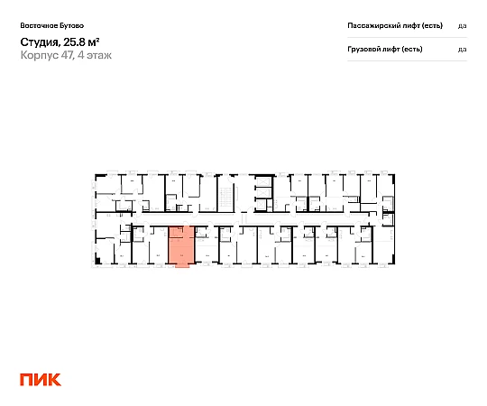 Продаётся квартира-студия площадью 25.80 кв.м на 4 этаже 25 этажного дома (Корпус 47, секция 3) проекта ПИК Восточное Бутово. Светлый просторный подъезд на уровне земли, функциональная планировка, большие окна, с отделкой.