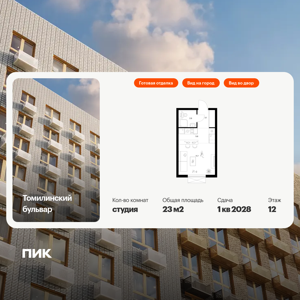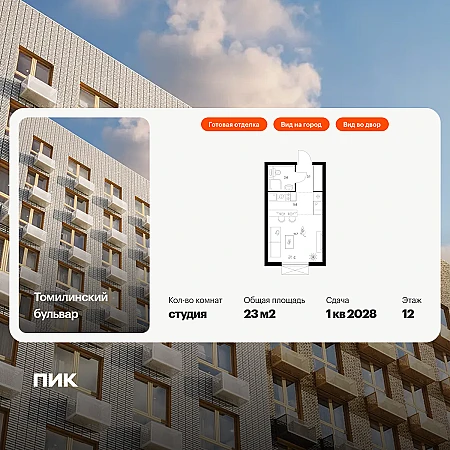 Продаётся квартира-студия площадью 23.00 кв.м на 12 этаже 25 этажного дома (Корпус 5-8, секция 2) проекта ПИК Томилинский бульвар. Светлый просторный подъезд на уровне земли, функциональная планировка, большие окна, с отделкой.