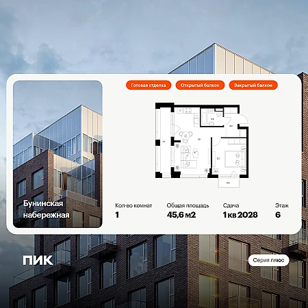 Продаётся 1-комн.квартира площадью 45.60 кв.м на 6 этаже 16 этажного дома (Корпус 2.6/1.3, секция 3) проекта ПИК Бунинская набережная. Светлый просторный подъезд на уровне земли, функциональная планировка, большие окна, с отделкой.