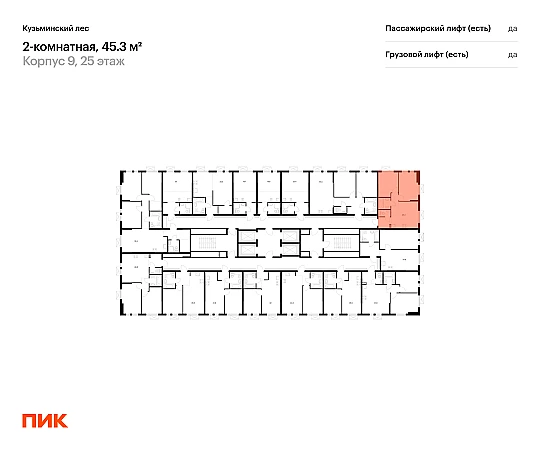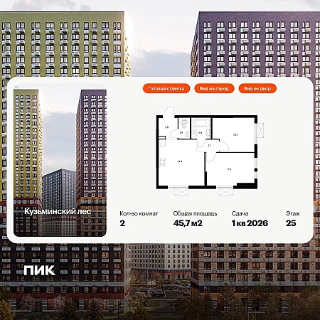 Продаётся 2-комн.квартира площадью 45.70 кв.м на 25 этаже 25 этажного дома (Корпус 9, секция 1) проекта ПИК Кузьминский лес. Светлый просторный подъезд на уровне земли, функциональная планировка, большие окна, с отделкой.