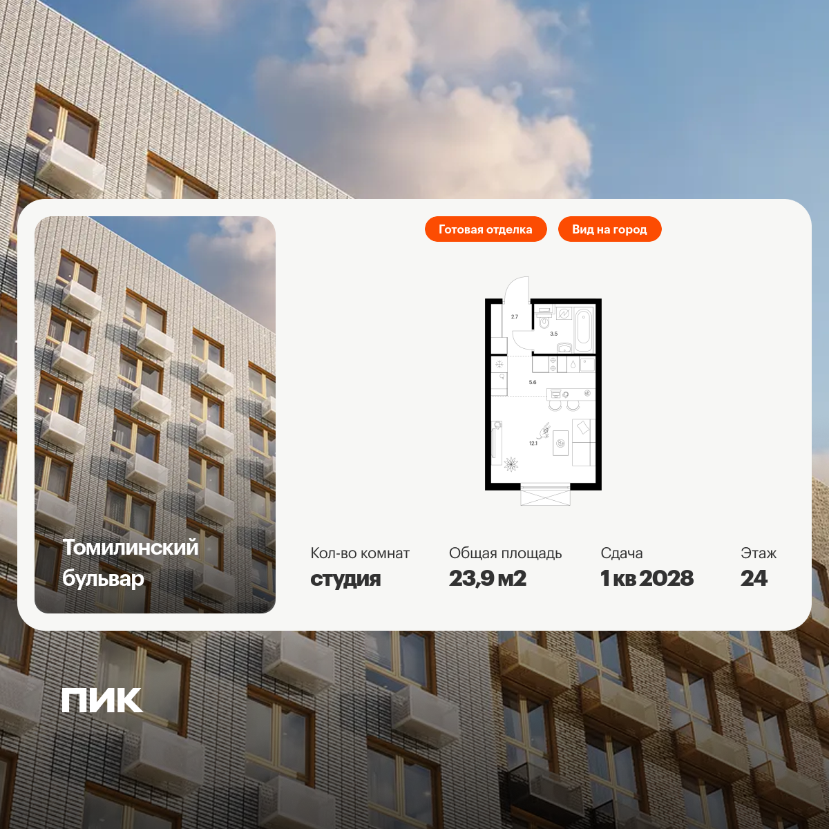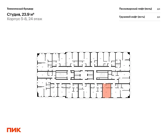 Продаётся квартира-студия площадью 23.90 кв.м на 24 этаже 25 этажного дома (Корпус 5-8, секция 1) проекта ПИК Томилинский бульвар. Светлый просторный подъезд на уровне земли, функциональная планировка, большие окна, с отделкой.