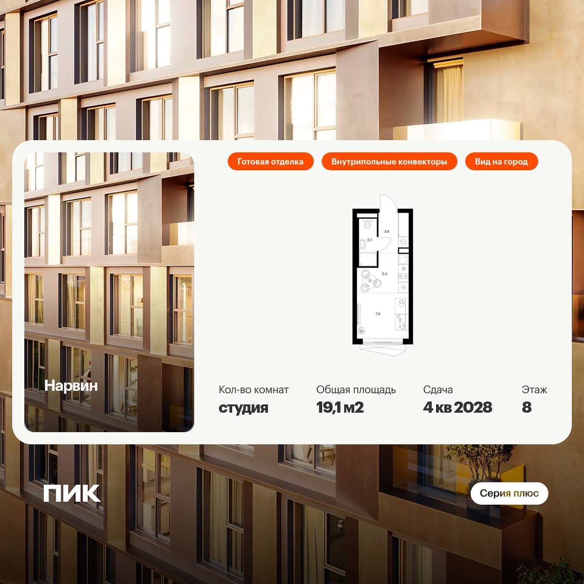 Продаётся квартира-студия площадью 19.10 кв.м на 8 этаже 38 этажного дома (Корпус 1.3, секция 3) проекта ПИК Нарвин. Светлый просторный подъезд на уровне земли, функциональная планировка, большие окна, с отделкой.