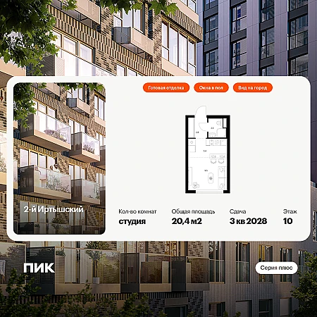 Продаётся квартира-студия площадью 20.40 кв.м на 10 этаже 43 этажного дома (Корпус 1.1, секция 1) проекта ПИК 2-й Иртышский. Светлый просторный подъезд на уровне земли, функциональная планировка, большие окна, с отделкой.