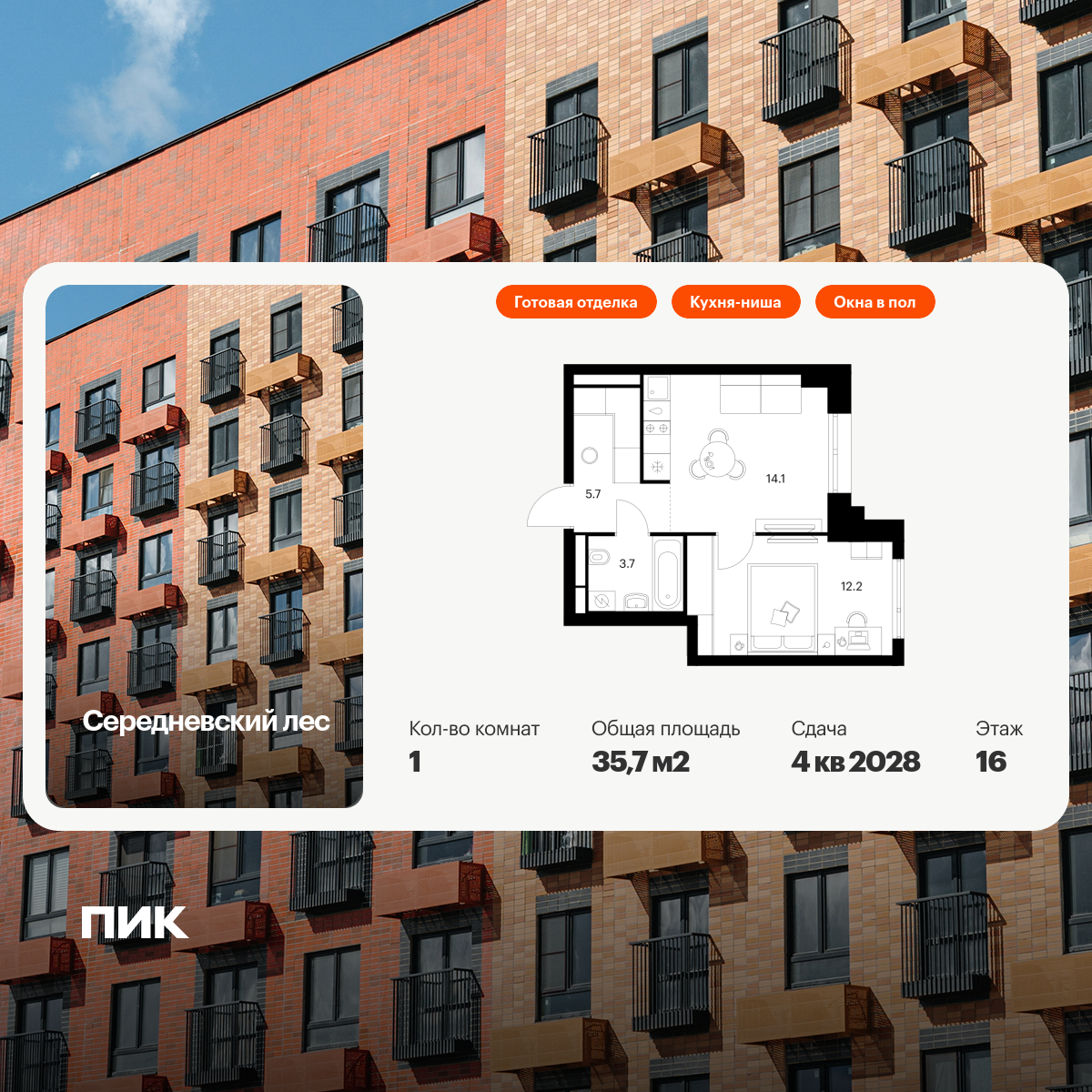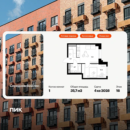 Продаётся 1-комн.квартира площадью 35.70 кв.м на 16 этаже 16 этажного дома (Корпус 2.1.1, секция 1) проекта ПИК Середневский лес. Светлый просторный подъезд на уровне земли, функциональная планировка, большие окна, с отделкой.