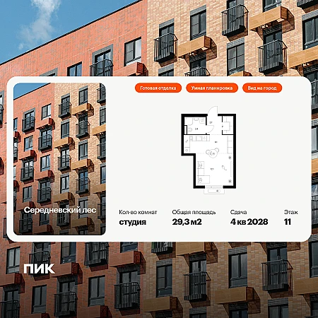 Продаётся квартира-студия площадью 29.30 кв.м на 11 этаже 16 этажного дома (Корпус 2.1.5, секция 5) проекта ПИК Середневский лес. Светлый просторный подъезд на уровне земли, функциональная планировка, большие окна, с отделкой.