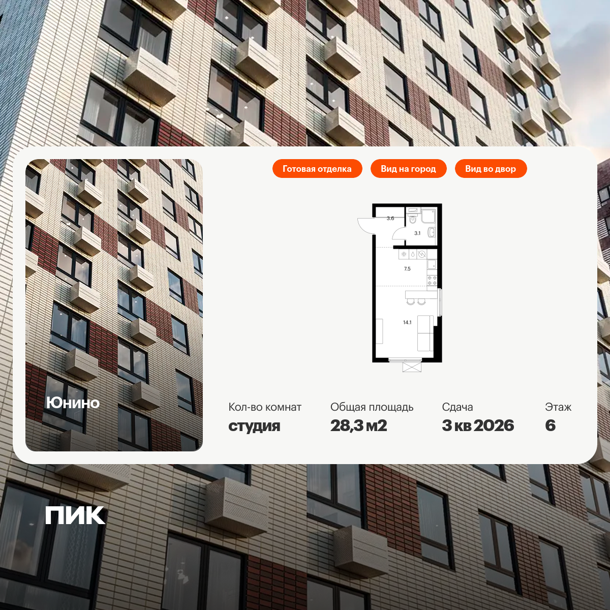 Продаётся квартира-студия площадью 28.30 кв.м на 6 этаже 17 этажного дома (Корпус 2.2, секция 2) проекта ПИК Юнино. Светлый просторный подъезд на уровне земли, функциональная планировка, большие окна, с отделкой.