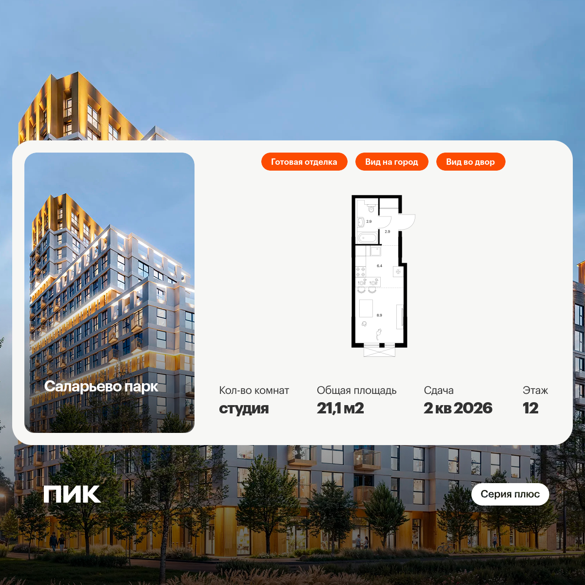 Продаётся квартира-студия площадью 21.10 кв.м на 12 этаже 17 этажного дома (Корпус 20, секция 1) проекта ПИК Саларьево парк. Светлый просторный подъезд на уровне земли, функциональная планировка, большие окна, с отделкой.