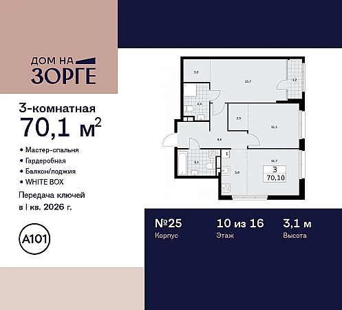 Продается трехкомнатная квартира с европланировкой и предчистовой отделкой в ЖК "Дом на Зорге" на 10 этаже. Общая площадь: 70.1 кв.м., жилая: 41 кв.м., суммарная площадь гостиной-столовой с кухонной зоной: 17.3 кв.м. Европейская планировка, площадь комнат позволяет разместить в них все необходимое, а в просторной кухне-гостиной удобно как готовить, так и отдыхать. Квартира угловая, идеально подойдет любителям тишины и панорамных видов. В квартире одна лоджия, два совмещенных санузла. Высота потолков 3.1 м.