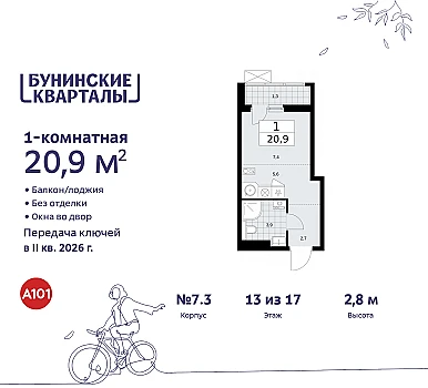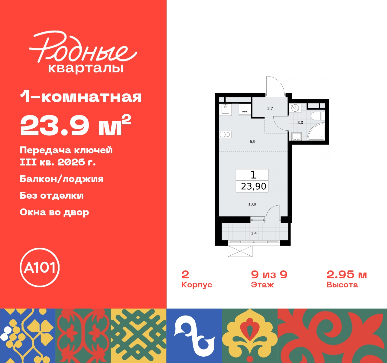 1-комн. квартира-студия в ЖК "Родные кварталы" на 9 этаже. Квартира без отделки, после оформления собственности можно делать ремонт. Общая площадь: 23.9 кв.м., площадь гостиной 16.8 кв.м., из которых 5.9 кв.м. выделено под кухонную зону. Все окна выходят на одну сторону. В квартире один балкон, один совмещенный санузел. Высота потолков 2.9 м.