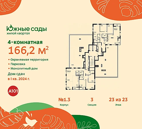 Просторная 4-комн. квартира в ЖК "Южные сады" на 23 этаже. Квартира без отделки, новый собственник может сделать ремонт по своему дизайн-проекту. Общая площадь: 166.2 кв.м. Наличие террасы в квартире дает возможность для создания зон отдыха в кругу семьи и друзей. Высота потолков 2.99 м.