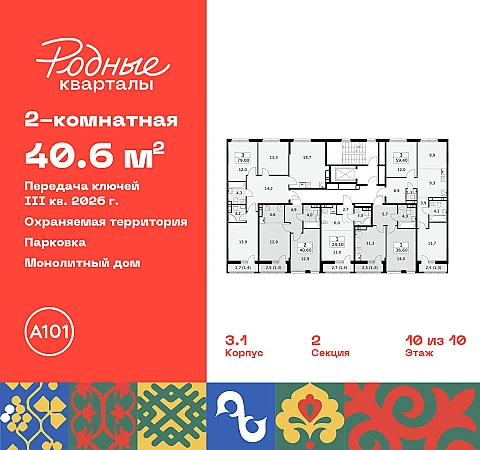 2-комн. квартира с европланировкой от застройщика в ЖК "Родные кварталы" на 10 этаже. Квартира без отделки, полностью готова к ремонту. Общая площадь: 40.6 кв.м., жилая: 25.8 кв.м., общая площадь гостиной-столовой с кухонной зоной: 17.5 кв.м. Европланировка, за счет большой площади кухни-гостиной квартира выглядит просторной и очень удобна для жизни. Комнаты изолированные, все окна выходят на одну сторону. В квартире одна лоджия, один совмещенный санузел. Высота потолков 2.95 м.