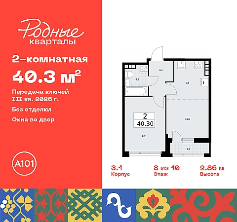Двухкомнатная квартира с европланировкой от застройщика в ЖК "Родные кварталы" на 8 этаже. Квартира без отделки, полностью готова к ремонту. Общая площадь: 40.3 кв.м., жилая: 21.2 кв.м., суммарная площадь гостиной-столовой с кухонной зоной: 22.5 кв.м. Европейская планировка, за счет большой площади кухни-гостиной квартира выглядит просторной и очень удобна для жизни. Комнаты изолированные, все окна выходят на одну сторону. В квартире одна лоджия, один совмещенный санузел. Высота потолков 2.95 м.