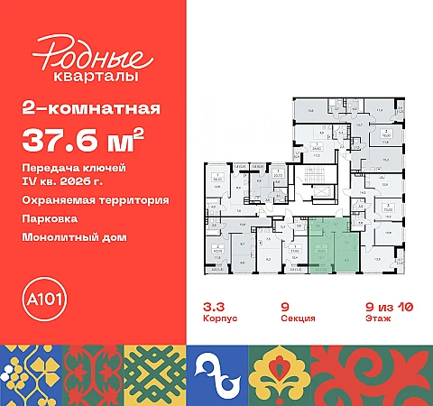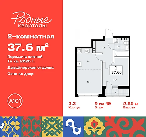 Двухкомнатная квартира с европланировкой и отделкой в ЖК "Родные кварталы" на 9 этаже. Общая площадь: 37.6 кв.м., жилая: 19.7 кв.м., суммарная площадь гостиной-столовой с кухонной зоной: 16.8 кв.м. Европейская планировка, кухня-гостиная - идеальный вариант для тех, кто любит часто принимать гостей. Комнаты изолированные, все окна выходят на одну сторону. В квартире одна лоджия, один совмещенный санузел. Высота потолков 2.95 м.